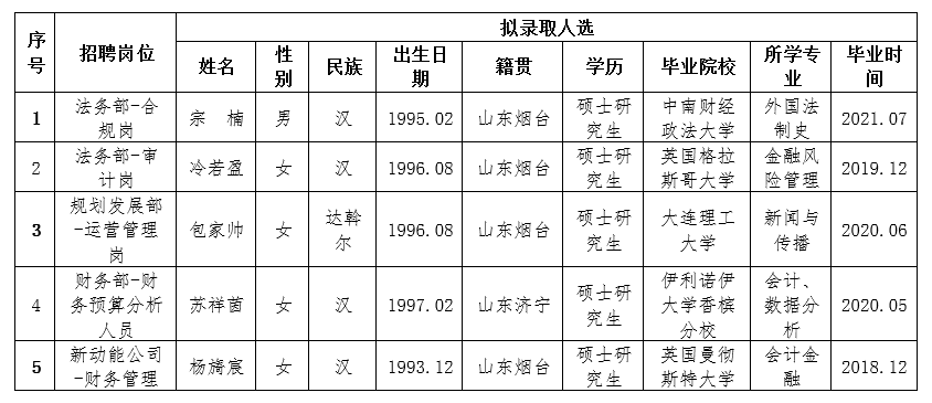 按照2020828日發(fā)布的《2020年煙臺(tái)財(cái)金集團(tuán)面向雙一流和全球TOP200高校畢業(yè)生公開招聘簡章》相關(guān)規(guī)定,經(jīng)過簡歷收集、資格審查、初試、復(fù)試、集體決策等環(huán)節(jié),擬確定部分崗位錄取人選(詳見下表),現(xiàn)予以公示,公示期為5個(gè)工作日(929日至1013日)。公示期間如有異議,請(qǐng)與煙臺(tái)市財(cái)金發(fā)展投資集團(tuán)有限公司聯(lián)系,電話:0535-6887256。